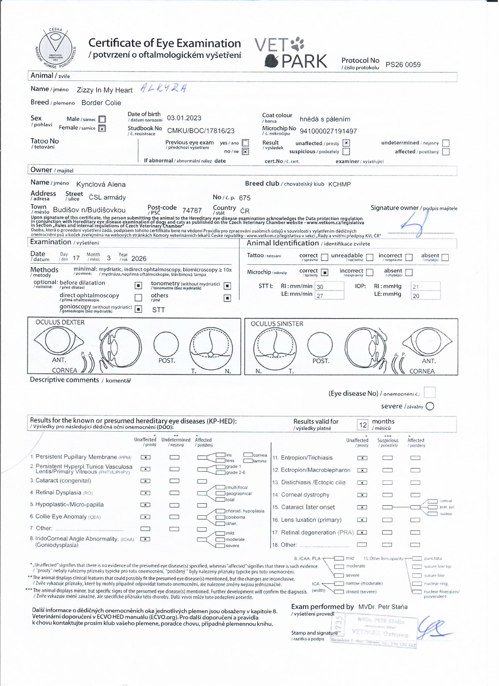 HD B, ED 0/0, OCD free, Spondylóza 0 LTV 0 L7 (MVDr. Ekr)